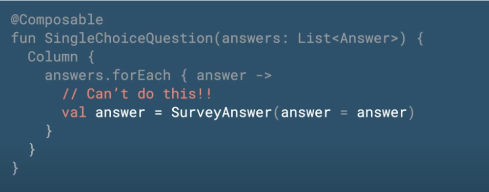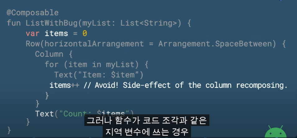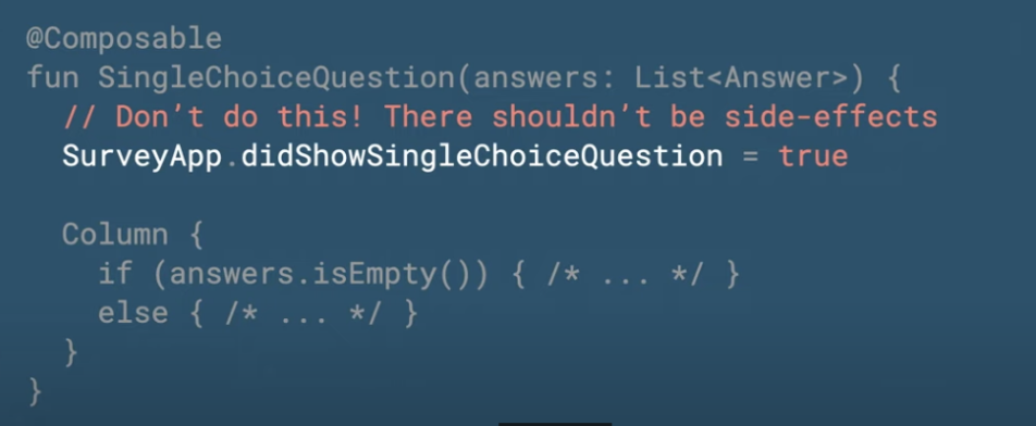 - 컴포즈 함수는 시도 때도 없이 실행될 수 있다.(Composable functions might run frequently)
