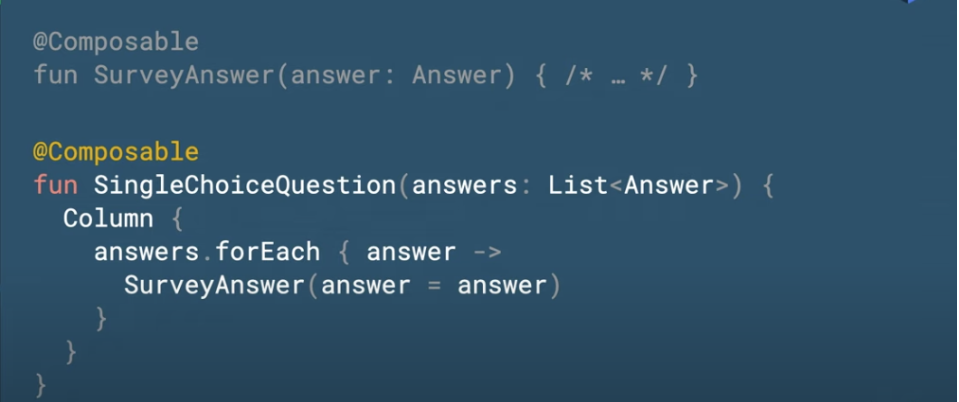 희안하게 초반부에 리사이클러뷰를 대체하는 lazyColumn 같은게 아닌 그냥 forEach를 통해서 리사이클러뷰 같이 리스트를 구성하는것을 보여준다.