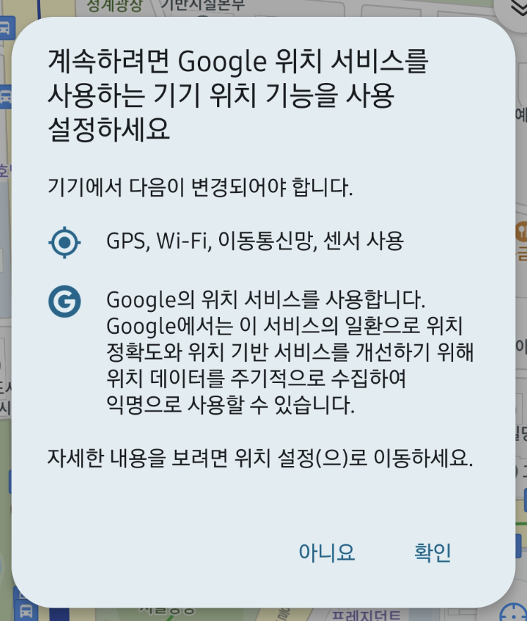 이 설정이 꺼져있으면 권한이 없는것과 마찬가지로 위치를 가져올 수 없다.