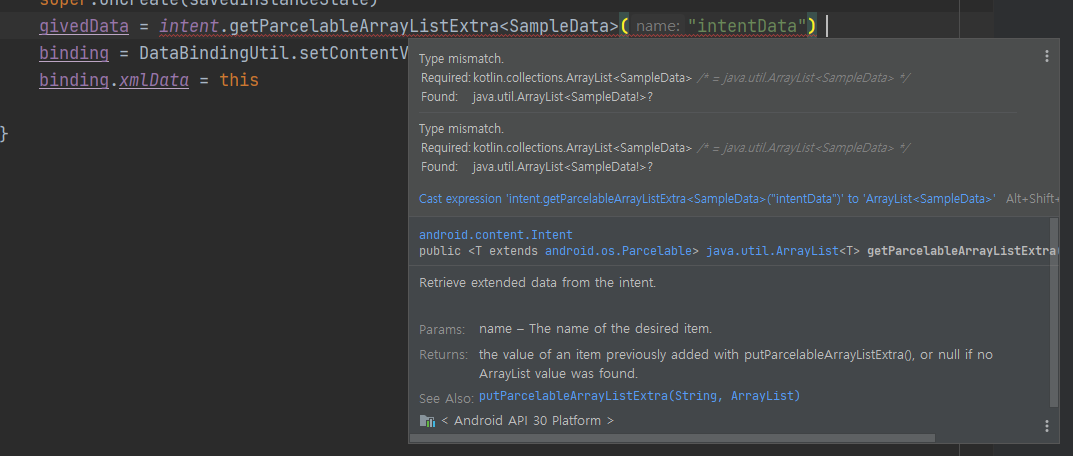 intent.getParcelableArrayListExtra<SampleData>("intentData") 는
