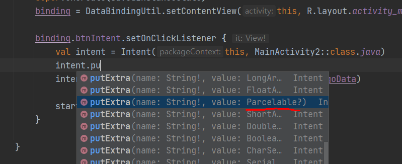 이렇게 Parcealble를 넘기는 putExtra를 사용해서 넘겨준다.