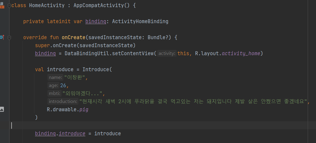 좀있다가 코틀린파일에서 binding.name에 정의한거 = 데이터클래스 인스턴스 이런식으로 데이터를 연결시켜서 xml에서 꺼내 쓸수있게 해주는것이다.(한마디로 xml에 변수 선언해놓고 코틀린파일에서 거기에 원하는 인스턴스 넣고 그대로 뽑아서 선언적으로 연결시켜주는것이다.)