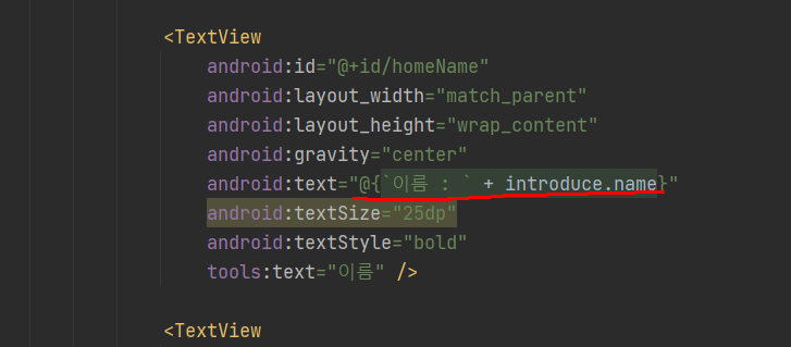 이제 마지막으로 text같이 데이터가 연결되는곳에 name으로 지정했던 introduce.변수명 을 @{} 로 감싸서 데이터를 뷰에 연결시켜버린다. 이미지의 표현식은 변수와 함께 문자열도 표현하고싶을때 @{`문자열`+변수명}으로 표현해주면 된다.