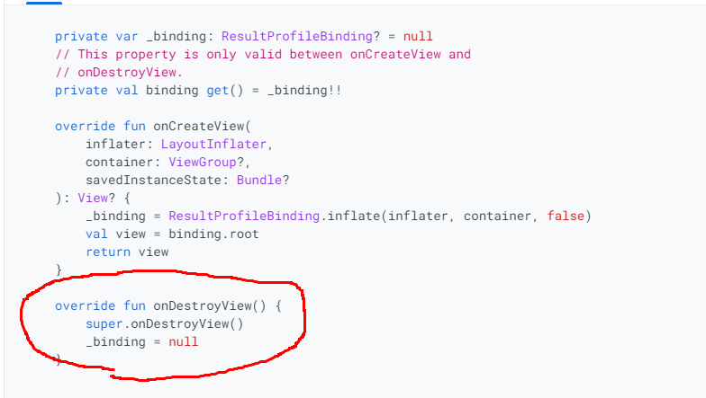 그리고 프래그먼트가 메모리에서 날아갈때 즉 사라질때 바인딩 인스턴스도 날려줘야한다. 바인딩 인스턴스도 날려버리기위한 코드도 추가해준다