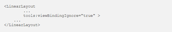 또한 바인딩 클래스를 생성하는 동안 레이아웃 파일을 무시하려면 tools : viewBindingIgnore = “true” 속성을 해당 레이아웃 파일의 최상단 루트에 추가해야한다.