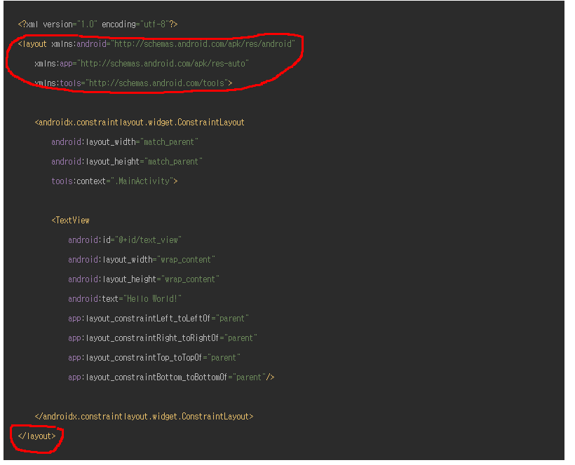data binding 사용하려면 xml 리소스는 <layout>태그를 루트태그로 가져야한다.
