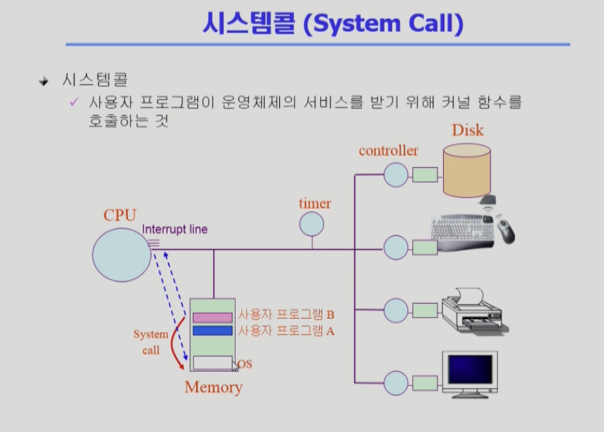 근데 그 서브루틴 혹은 제어문 if문 이런것들을 만나면 메모리 주소 공간을 점프하고 계속 돌고 할텐데 결국 사용자 프로그램이 점프할수있는 메모리범위는 그 사용자프로그램 범위내이다 mode bit 이 1이기 때문에 운영체제의 메모리로 직접 접근하거나 하는건 다 막혀있다. 그래서 사용자 프로그램이 시스템을 콜해야하는 상황이 온다면 interrupt line을 세팅하는 instruction을 생성한다. 사용자 프로그램이 I/O를 위하여 interrupt를 걸수있다.-> cpu 제어권이 운영체제로 넘어간다.