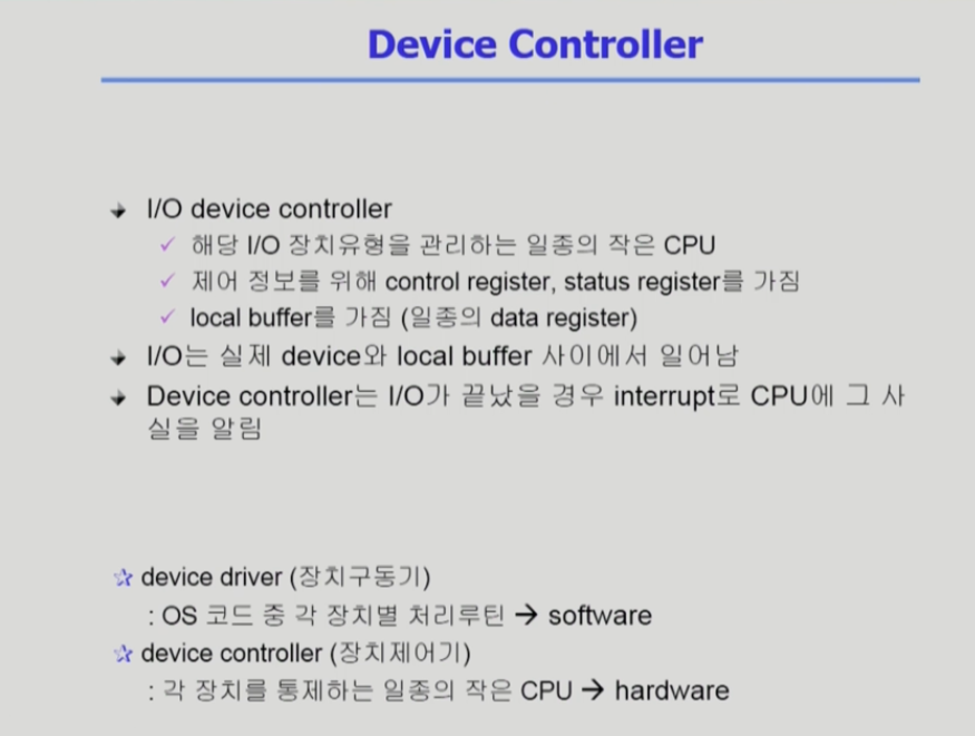 I/O device 들은 각각의 디바이스들을 전담하는 작은 cpu 같은 device controller 들을 가지고있다.
