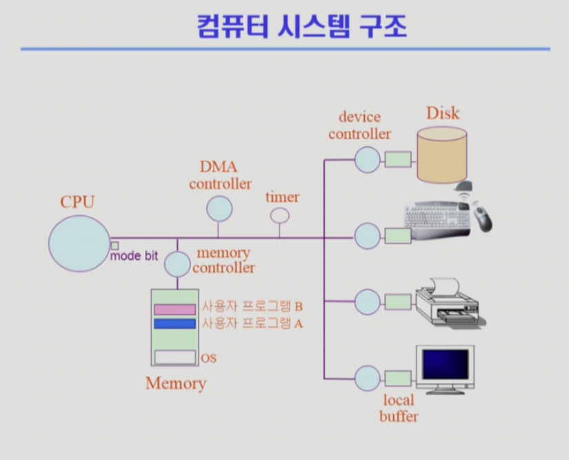 결국 cpu는 메모리랑만 일한다. 디스크에서 읽어오라는 instruction 이있는 경우 직접 디스크에 접근하는것이 아닌 divice controller에게 읽어오라고 일을 시킨다. -> 일을 시키는 instruction 이있다. -> 읽어오는 작업 오래걸린다 -> 읽어오라고 일만시키고 다른일 그대로 한다.(만약 결과값을 받아서 처리해야하는 경우 cpu점유권이 다른 프로그램으로 넘어간다)-> 읽어온 내용들 일단 local buffer 에 쌓인다. -> interrupt line 으로 I/O의 일이 다끝났음을 알린다.