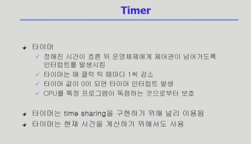 할당된 시간내로 cpu를 이용할수있다. -> 시간이 초과하면 타이머가 interrupt를 cpu에 걸어준다. cpu 를 시분할로 사용하기위한 하드웨어