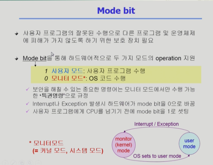 mode bit 라는것이 cpu 내부에 존재하는데 현재 실행되고 있는것이 운영체제인지 사용자프로그램인지를 구분해주는 역할이다.