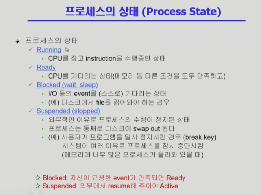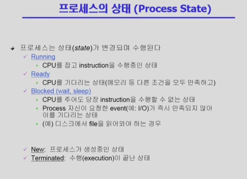Blocked: cpu 를 줘봤자 일못하는애들 (오래걸리는 I/O 작업이 끝나야 추후의 작업을 할수있는것들) ex) 디스크에서 파일읽어오는 중이것들
