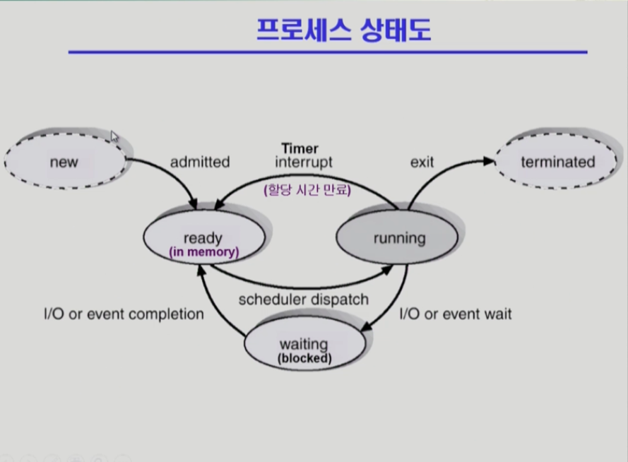 Ready: cpu 쓸려고 기다리는애들(다른 조건들 다 만족해야함 cpu 만 얻으면 바로 일할수있는애들 I/O에서 받은 정보 같은거 다 메모리에 이미 올라와서 바로 일할수있는 것