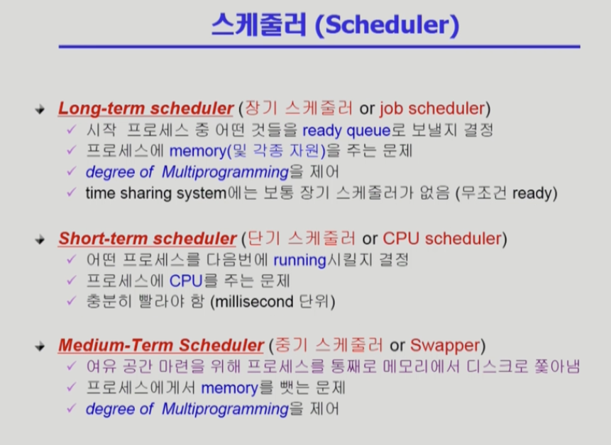 Long term scheduler(장기 스케줄러 job 스케줄러 메모리를 어떤 프로세스에게 줄지 결정하는 스케쥴러)