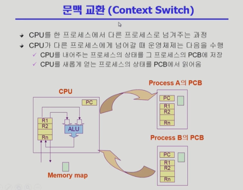 cpu 를 얻게된 프로세스도 pcb에 저장되어진 정보를 cpu에 복원시킴 그다음에 cpu를 넘겨줌