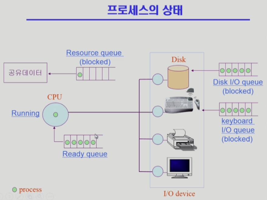 I/O 가 일어나면 각 I/O 장치 queue에 프로세스가 줄설것이다.(blocked로 바뀜)