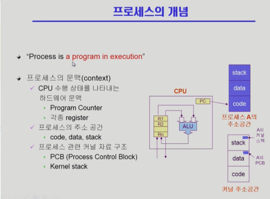 프로세스가 실행되면 독자적인 VM 에 공간이 생기고 거기에 code,data,stack 가 생기고 cpu가 거기에 당장 읽고있는 부분을 pc(program counter)가 가리킨다. 매순간 기계어를 읽어서 레지스터에 값을넣고 ALU(산술 연산장치에서 계산해서) 다시 레지스터에 값을 올리던 아님 메모리에 값을 수정하던 한다.