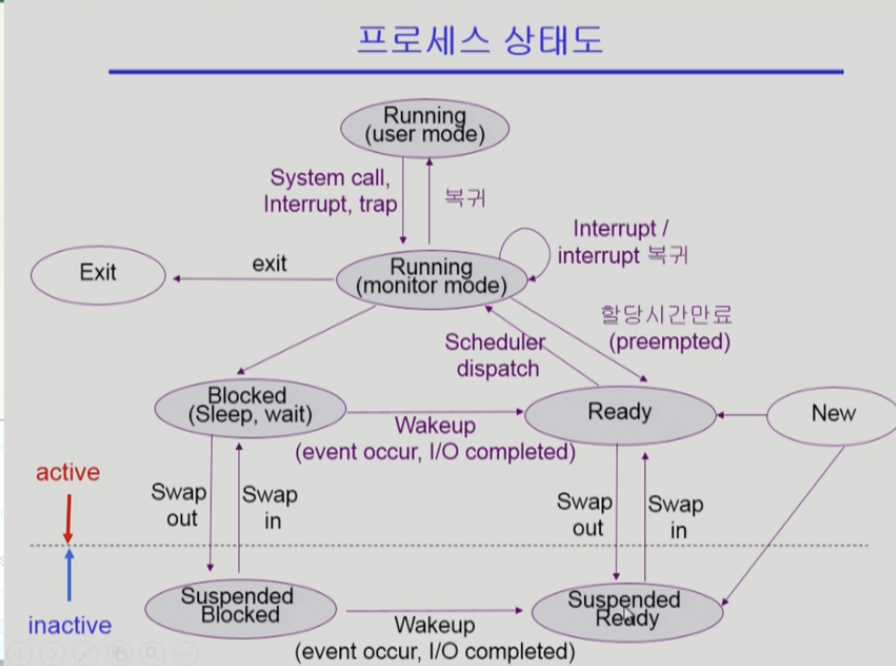 운영체제가 cpu 를 가지고있는경우에도 최근에 running 하고있던 프로세스가 그대로 running 인것임 운영체제가 running 하고있다 이런게 아님(monitor mode-> 운영체제가 cpu 잡고있는것)