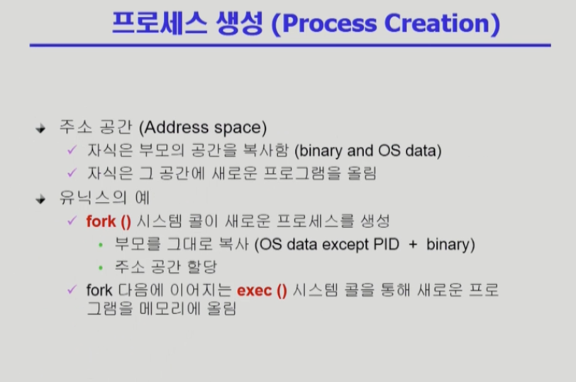 -> fork()로 복제를 뜨고 그다음에 exec()라는 시스템 콜을 통해 새로운 내용을 덮어씌운다.