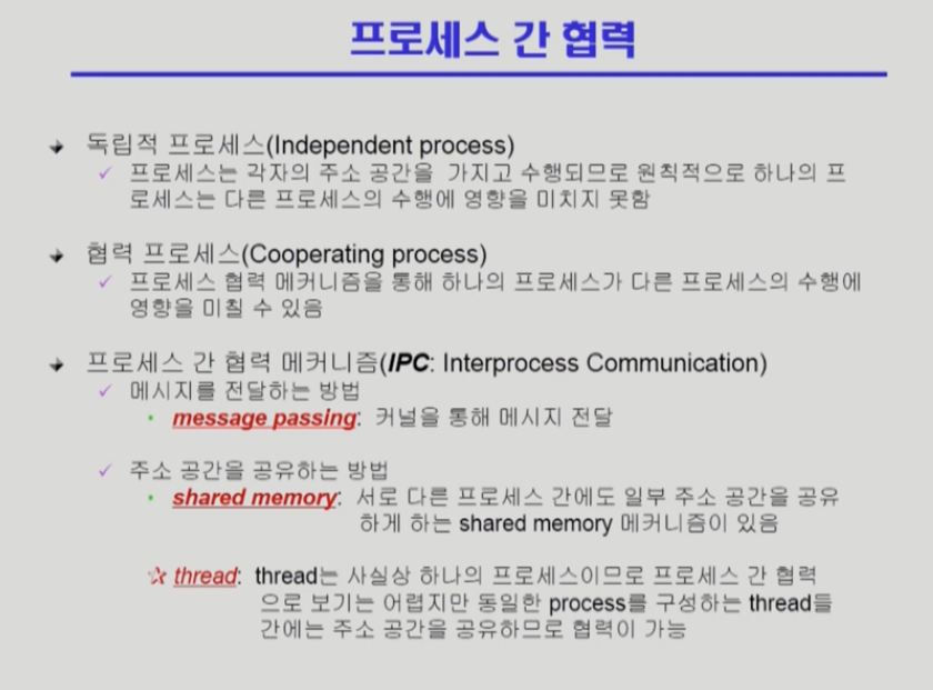 -> 프로세스는 원래 독립적이다 자기 메모리 공간만 볼수있고 프로세스가 다른 프로세스에게 직접 메시지를 전달할수있는 방법은 없다.