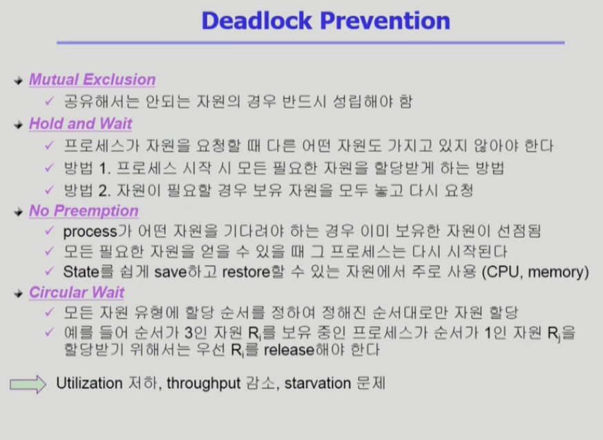 이렇게하면 데드락은 막을수있지만 자원에대한 이용율이 낮아지고 전체시스템의 성능이 낮아니고 starvation 이 걸릴수도있다