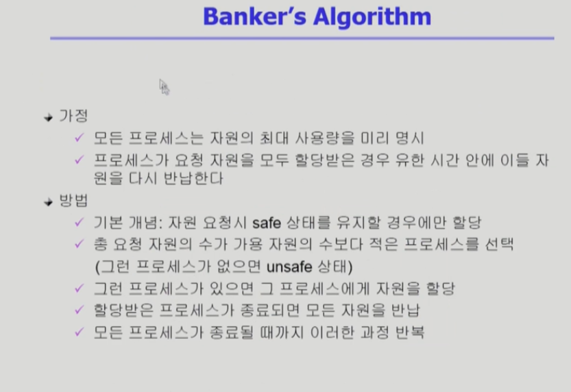deadlock avoidance 의 경우 프로세스가 시작될때 이프로세스가 평생 쓸 자원의 양을 알고있다 가정하고 그 데드락을 피해가는것이다.