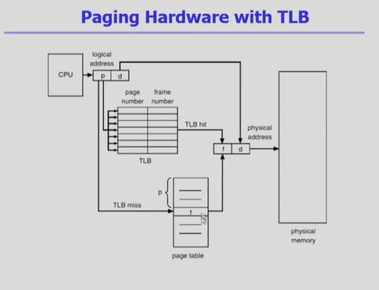 메인메모리 보다 빠른 캐시 메모리(운영체제 입장에서는 감추어진 계층이다 컴퓨터 구조적인 측면에서만 바라봄) TLB 를 운용하여 page table 의 일부를 가지고있는 것이다(빈번하게 불리는 것들만 가지고 있는것이다).