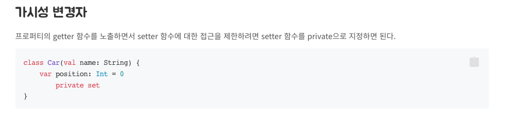 그래서 코틀린은 변수를 선언할때 기본적으로 getter,setter도 자동으로 생성된다.