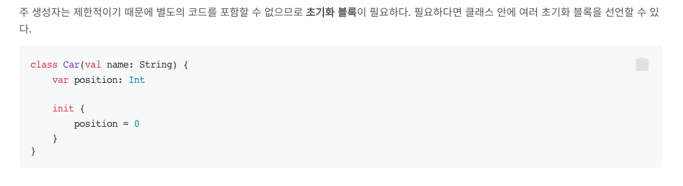 ->생성자 파라미터를 지정하는것 뿐만 아니라 생성자 파라미터를 지정하고 파라미터에 의해 초기화되는 프로퍼티를 정의한다.