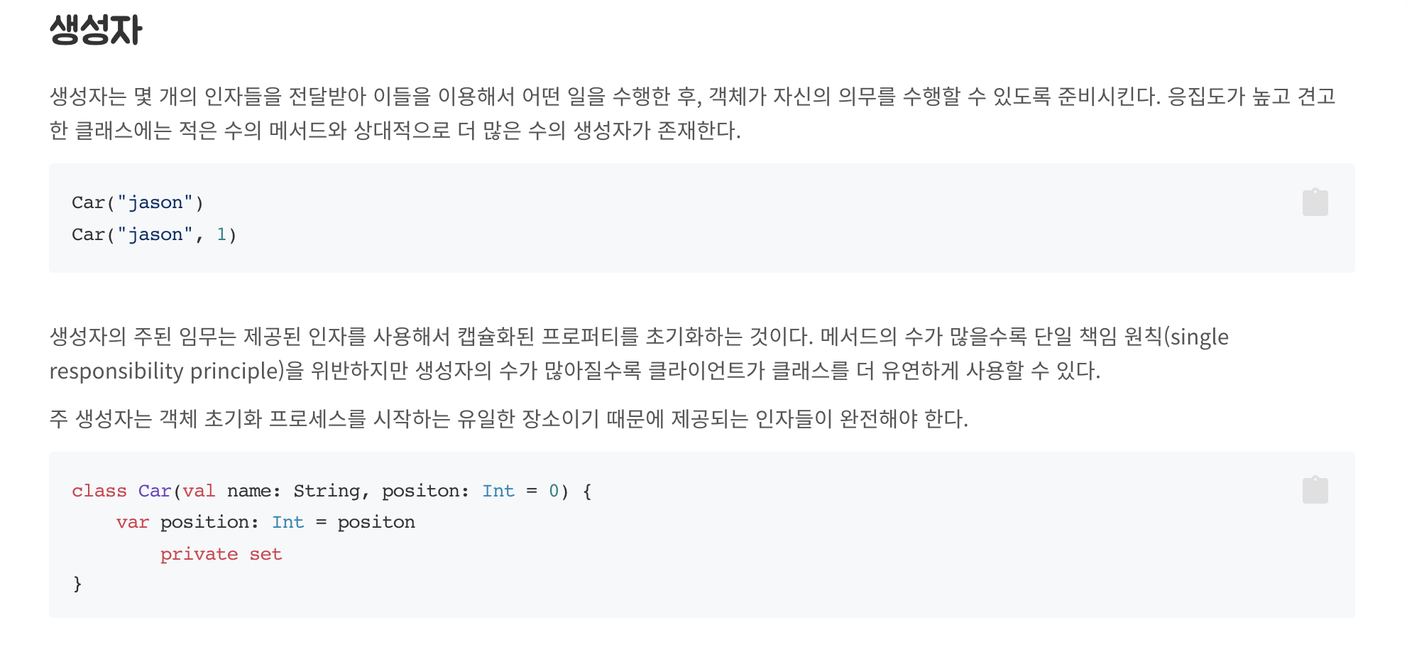 함수가 많을수록 단일책임원칙에 벗어날 가능성이크니 생성자를 이용해서 함수를 줄이자.